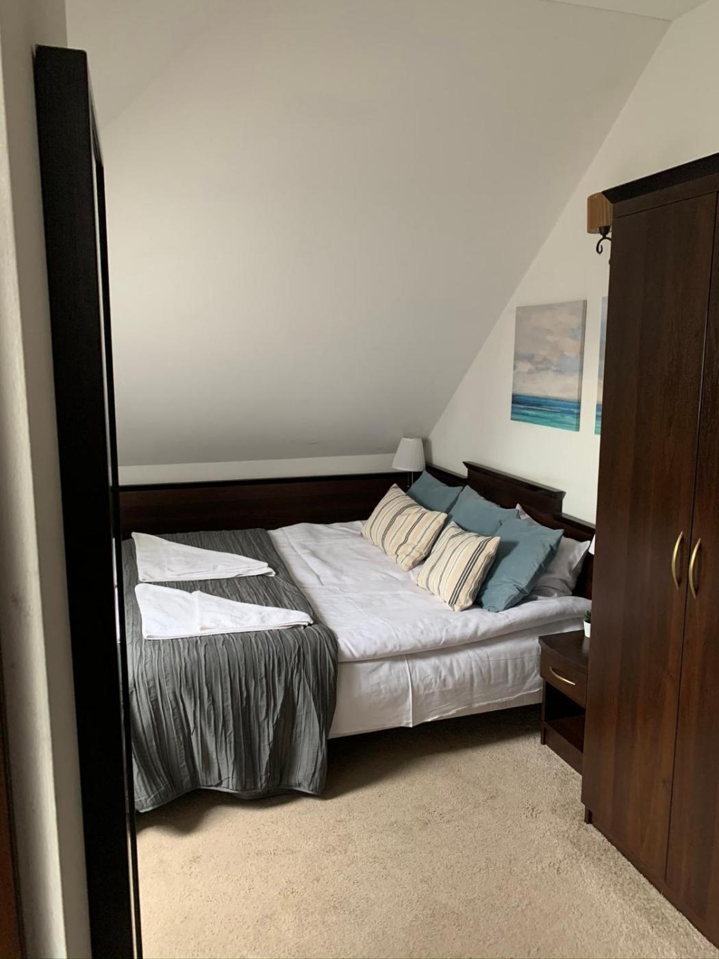Pokój dwuosobowy na poddaszu z prywatną łazienką poza pokojem. Jest to klimatyzowany pokój dwuosobowy z 1 lub 2 łóżkami. Pokój ten ma wysokość tylko 1,90 metra. Znajdują się w nim także skośne sufity oraz okna dachowe. Pokój Dwuosobowy z 1 lub 2 łóżkami - 3 osobowy. Powierzchnia pokoju ok.: 18 mkw. ;