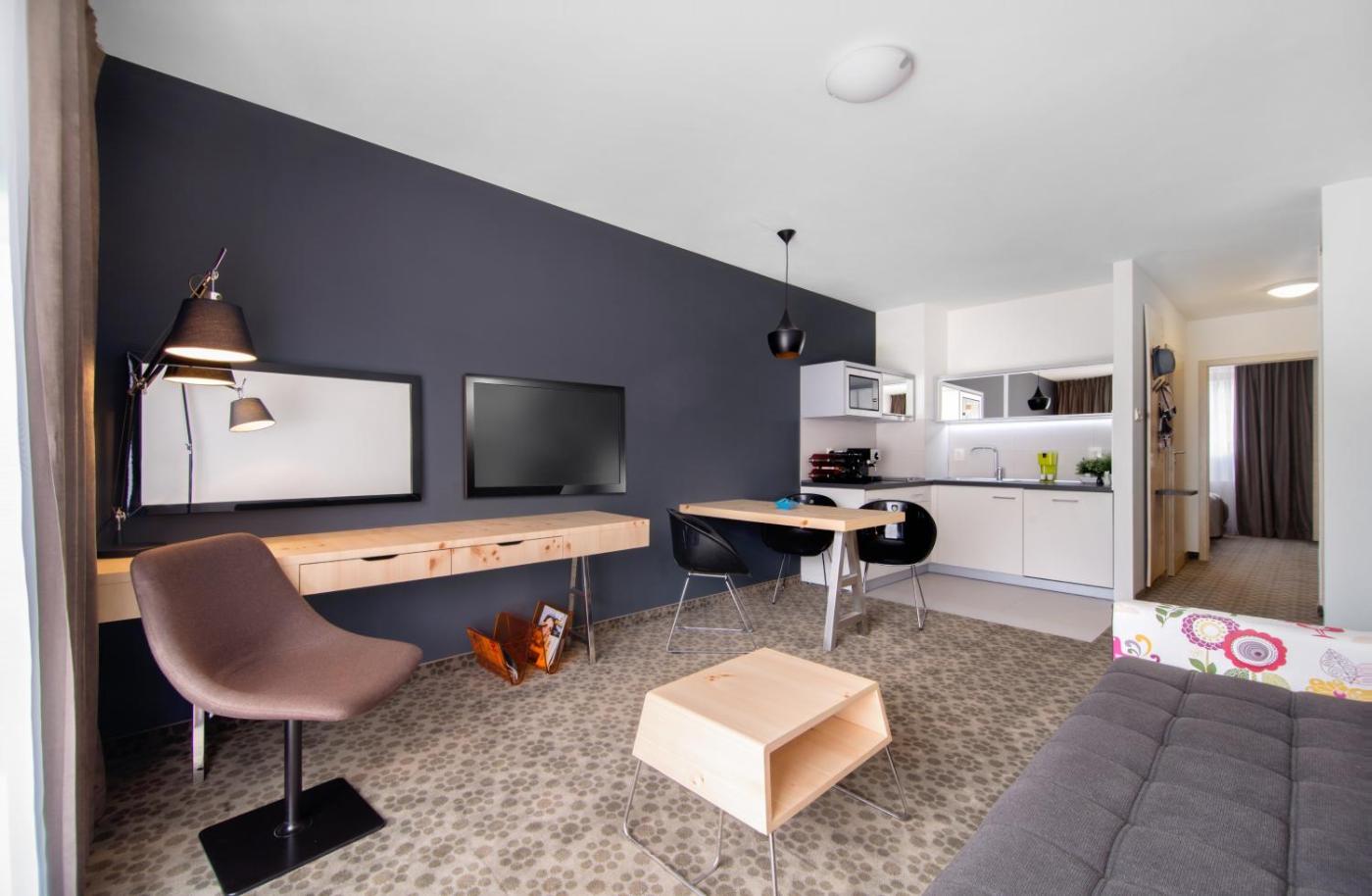 Każdy apartament mieści salon z częścią wypoczynkową i dobrze wyposażonym aneksem kuchennym. Dla gości przygotowano niezbędne przybory kuchenne, czajnik oraz zmywarkę do naczyń.