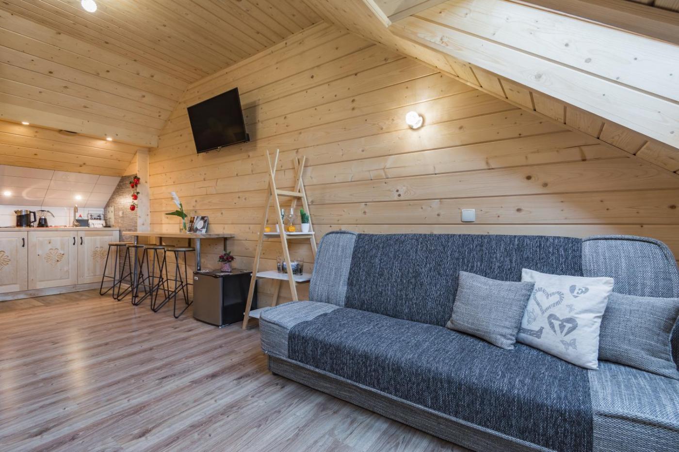 Apartament typu studio. The fireplace is the standout feature of this suite. This suite includes 1 bedroom, a kitchenette and 1 bathroom with a walk-in shower and a hairdryer. Guests will find a stovetop, a refrigerator, kitchenware and an oven in the well-equipped kitchenette. The suite also features a barbecue. Boasting an outdoor dining area, this suite also offers a tea and coffee maker, a wardrobe and a flat-screen TV. The unit has 2 beds. Apartament typu Suite - 4 osobowy. Powierzchnia pokoju ok.: 25 mkw. ;